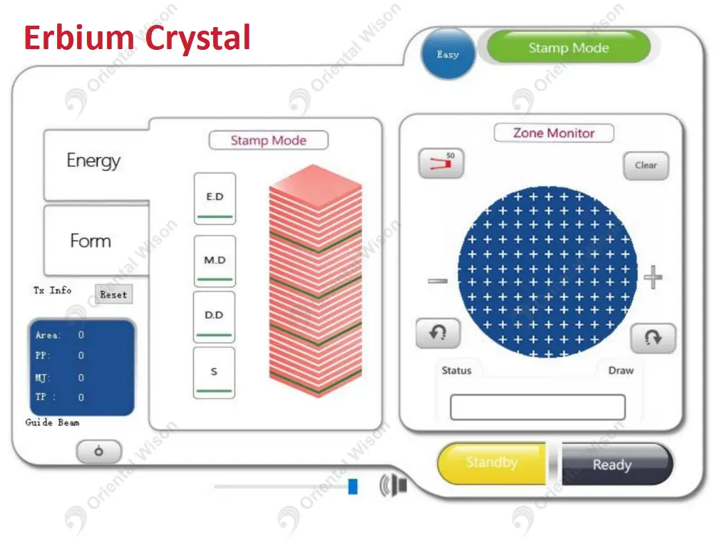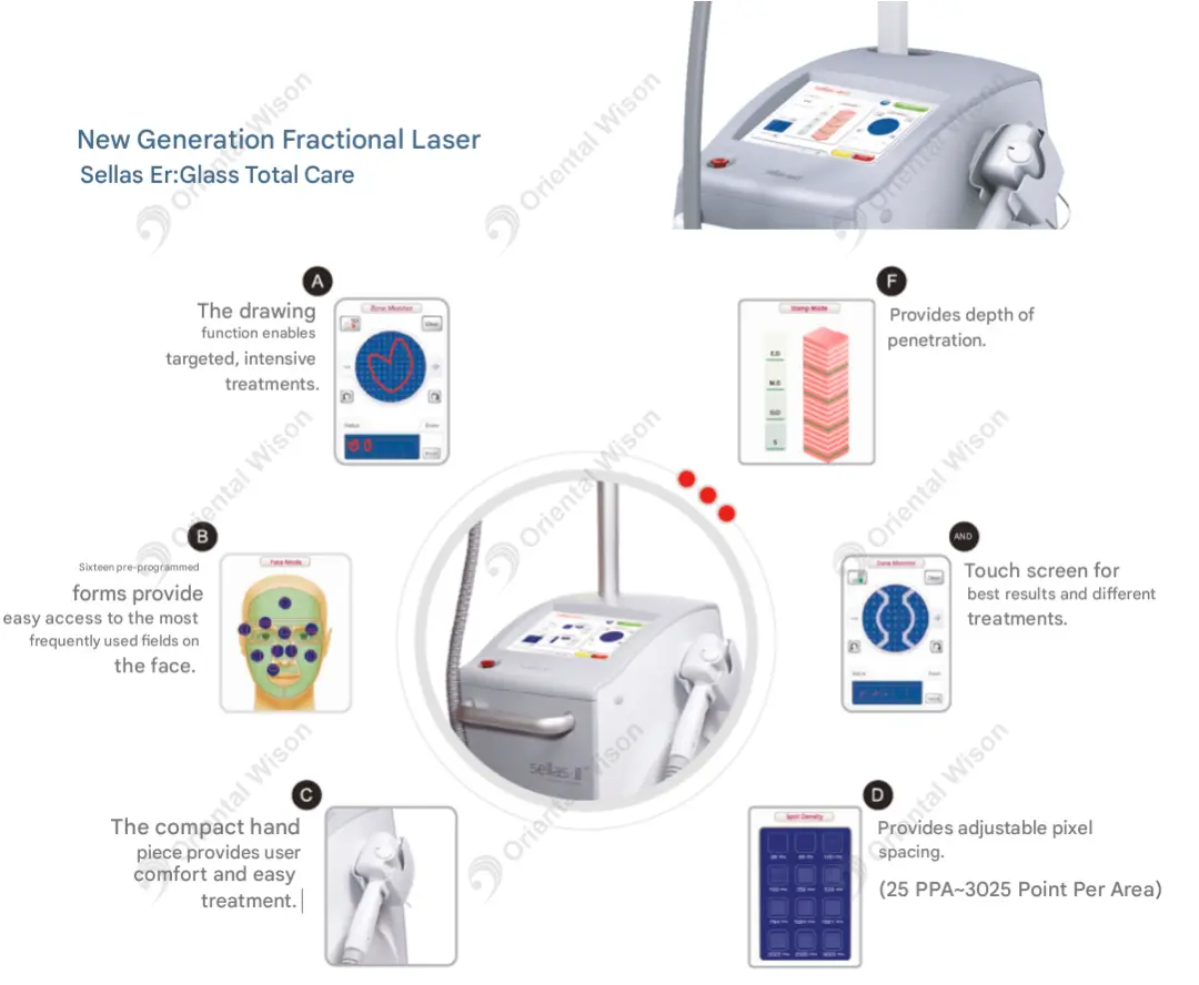É um sistema de laser Er: glass não invasivo com comprimento de onda de 1550 nm. O comprimento de onda de 1550 nm aplica pulsos térmicos profundamente na derme através da epiderme, onde são absorvidos pela água do tecido e levam a altas temperaturas no interior do tecido. O tecido é aquecido suavemente e resulta na decomposição das células, enquanto a superfície da pele permanece intacta.